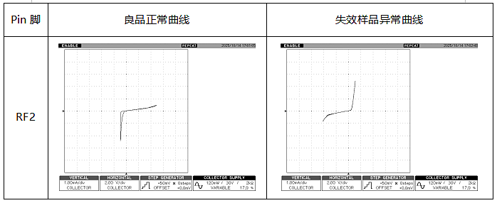 IV量测 与良品比对,失效样品1#“RF2-GND”IV 曲线明显有差异