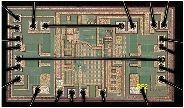 依照产品Pin脚结构图(如下图),对产品所有功能Pin进行IV信号量测,并与良品进行比对,其中发现RF2功能pin对地漏电明显。