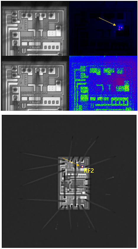 通过OBIRCH(镭射光束诱发阻抗值变化测试)测试手段,对漏电异常RF2脚进行追踪,在晶圆表面呈现异常热点。